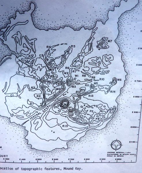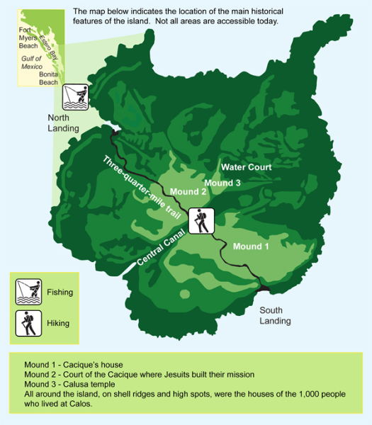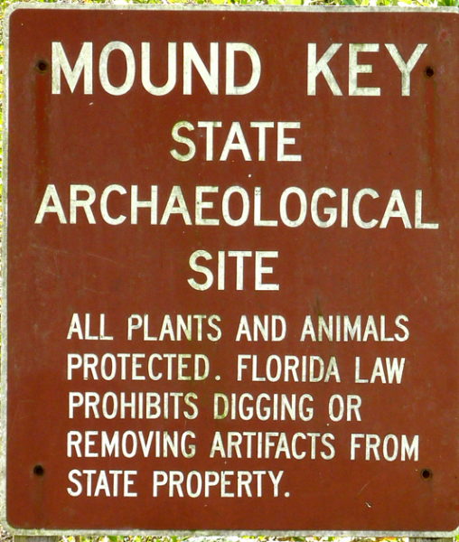 MOUND KEY: Framed in forests of mangrove trees, the shell mounds and ridges of Mound Key rise more than 30 feet above the waters of Estero Bay. Prehistoric Native Americans are credited with creating this island’s complex of mounds with an accumulation of seashells, fish bones, and pottery. Mound Key is believed to have been the ceremonial center of the Calusa Indians when the Spaniards first attempted to colonize Southwest Florida. In 1566, the Spanish governor of Florida established a settlement on the island with a fort and the first Jesuit mission in the Spanish New World. The settlement was abandoned three years later after violent clashes with the Indians. The only access to the island is by boat; there are no facilities. Interpretive displays can be found along a trail that spans the width of the island. Located in Estero Bay, several miles by boat from Koreshan State Historic Site or Lovers Key State Park.